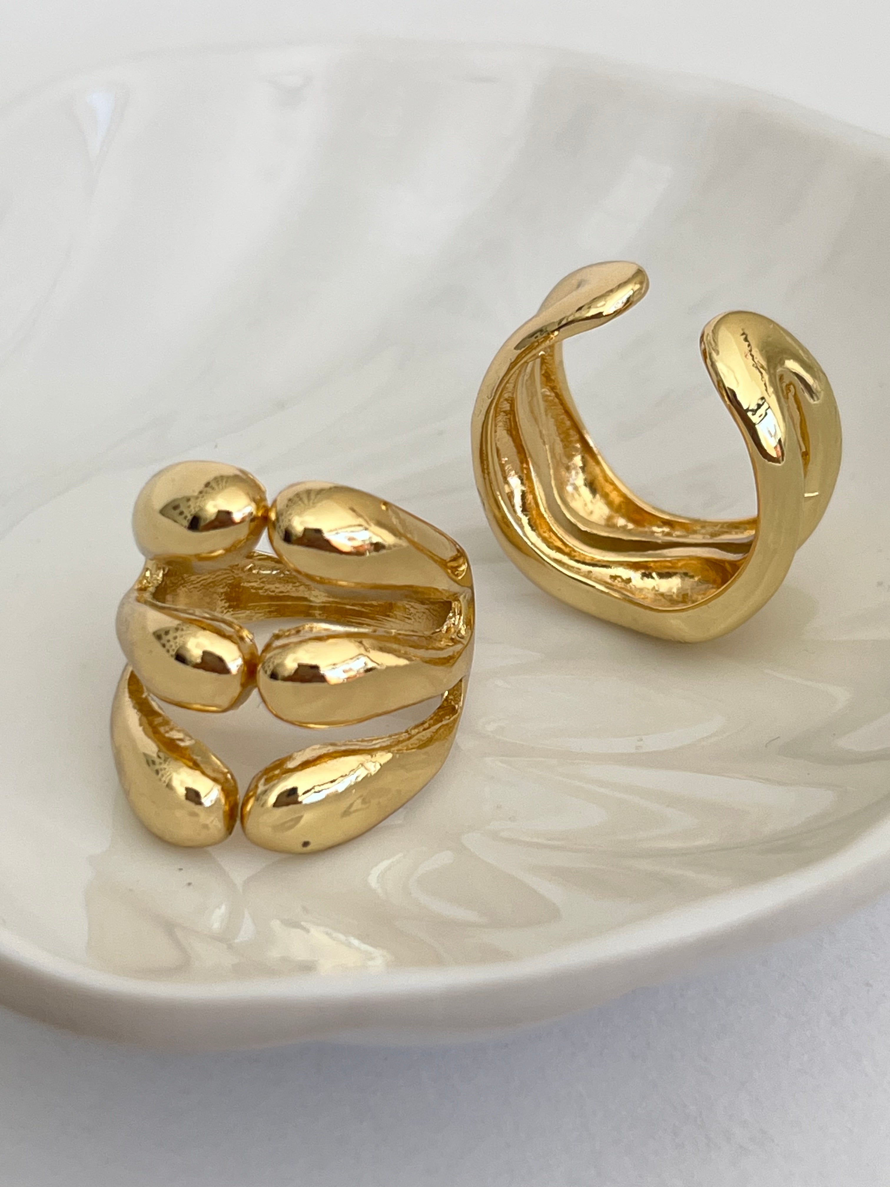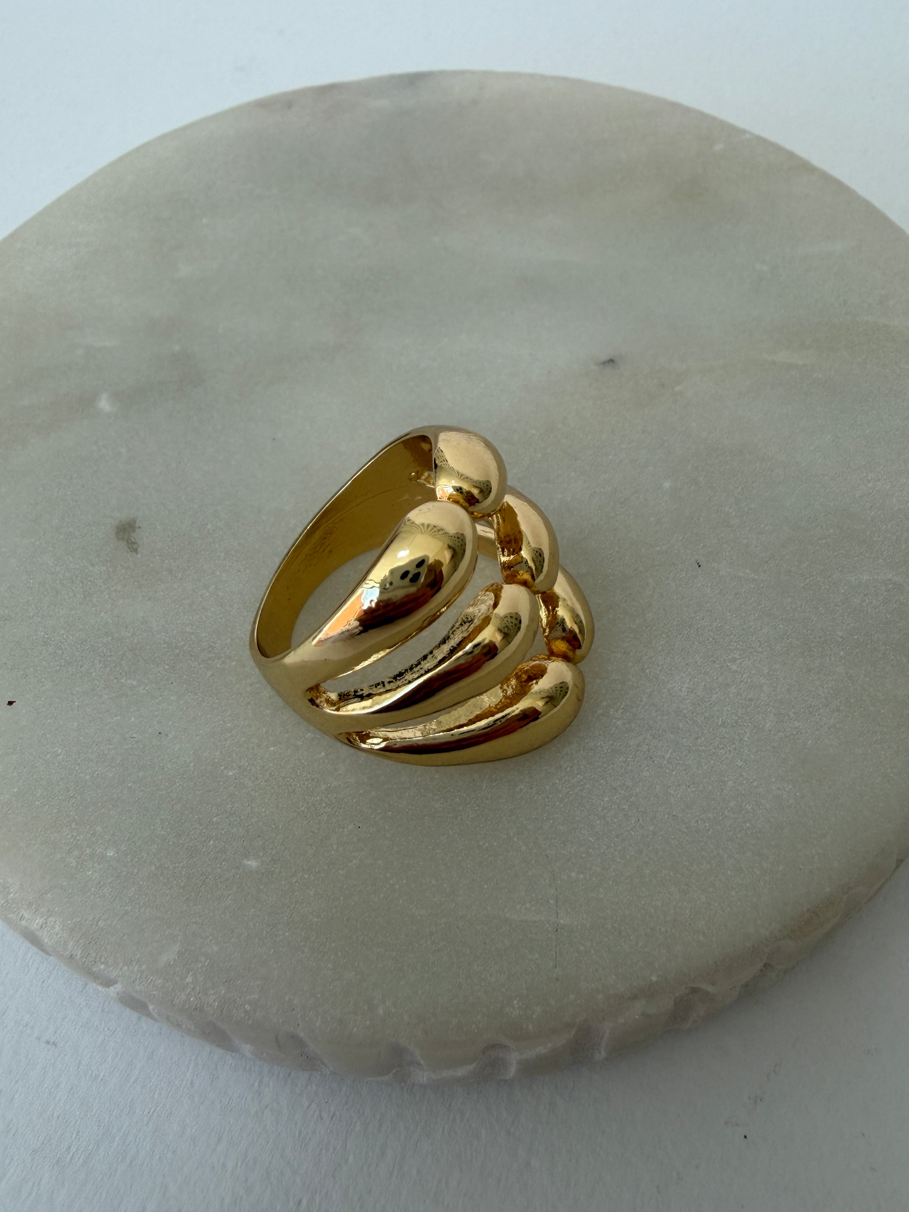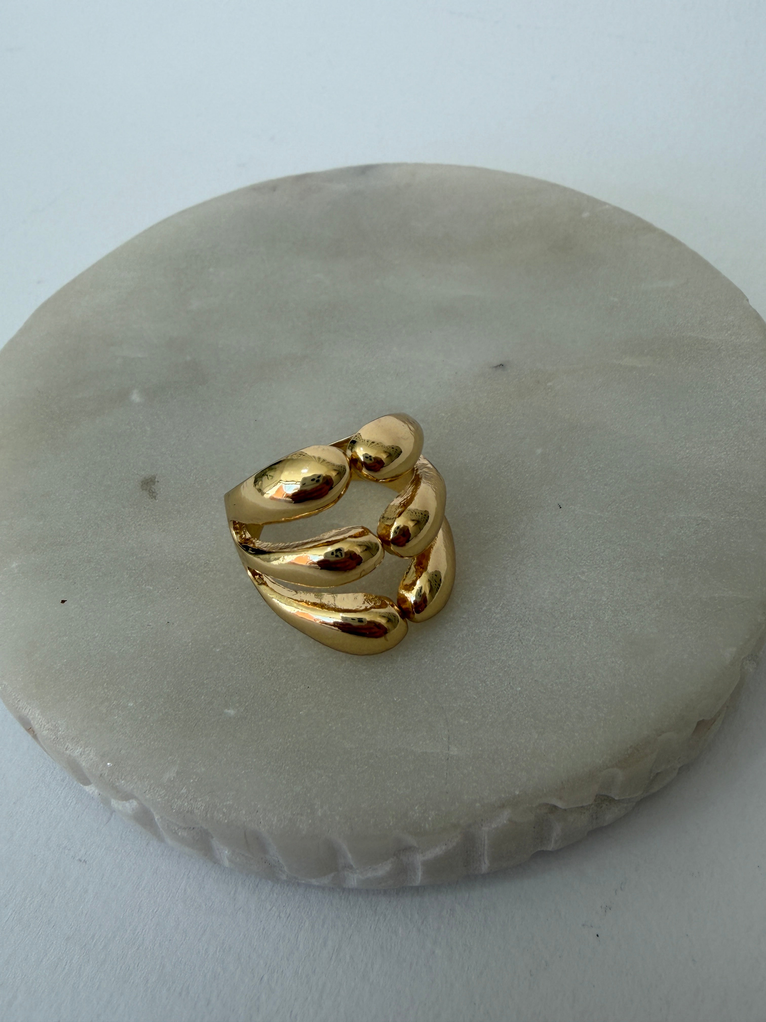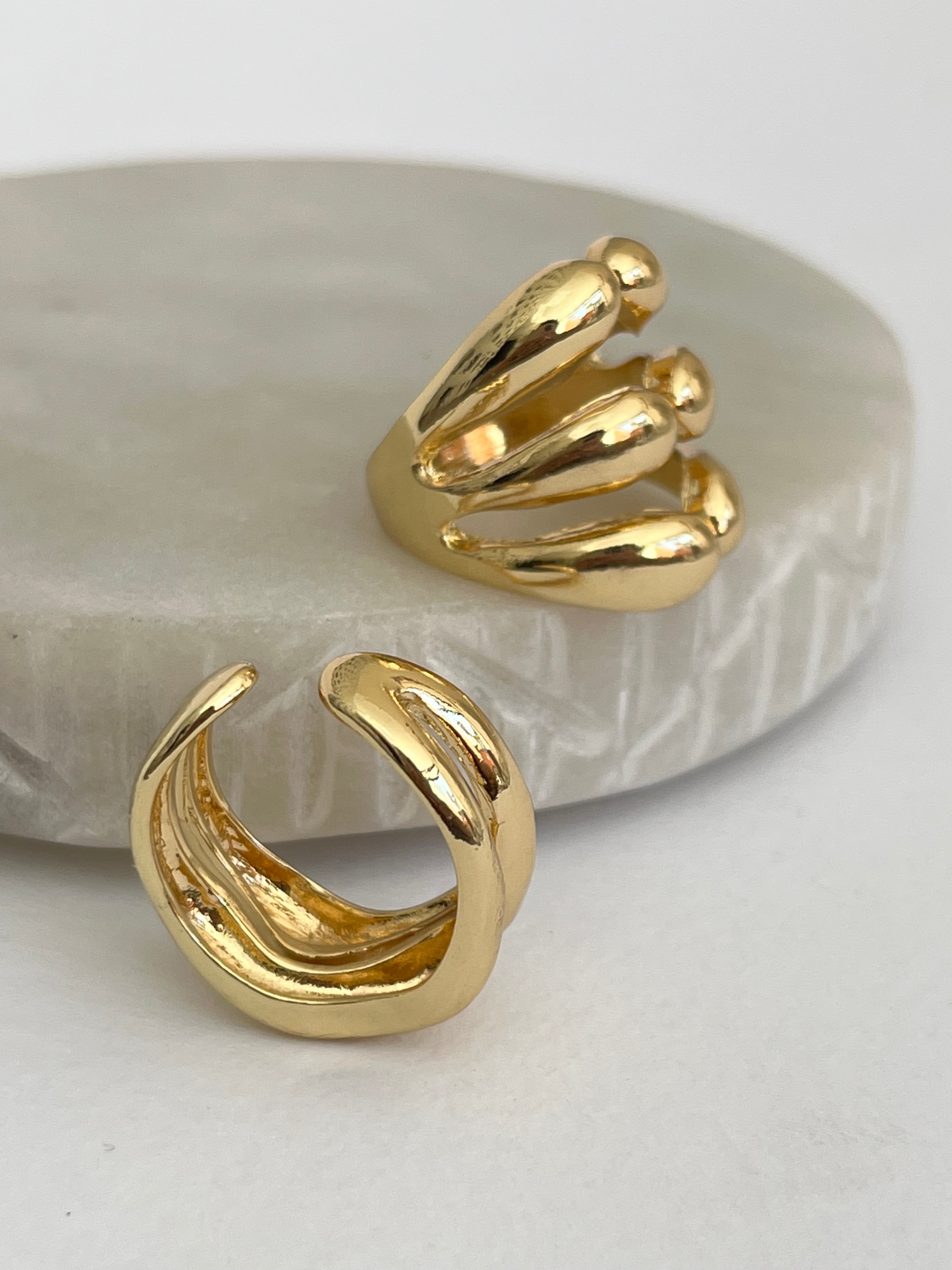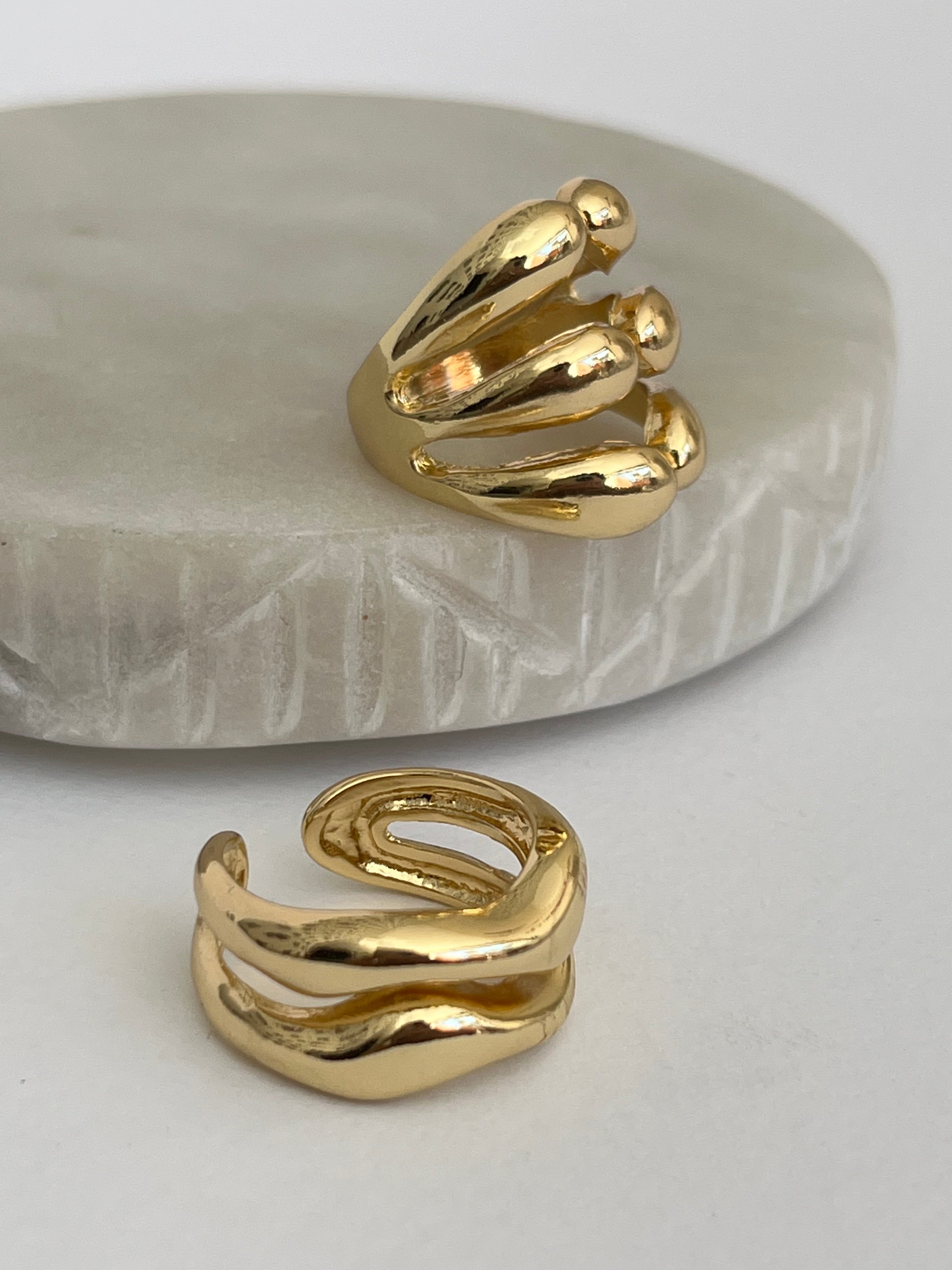 Alejandra es un anillo de brass en baño de oro, perfectamente regulable y conformado por tres niveles. Ideal para resaltar y elevar todos los looks.