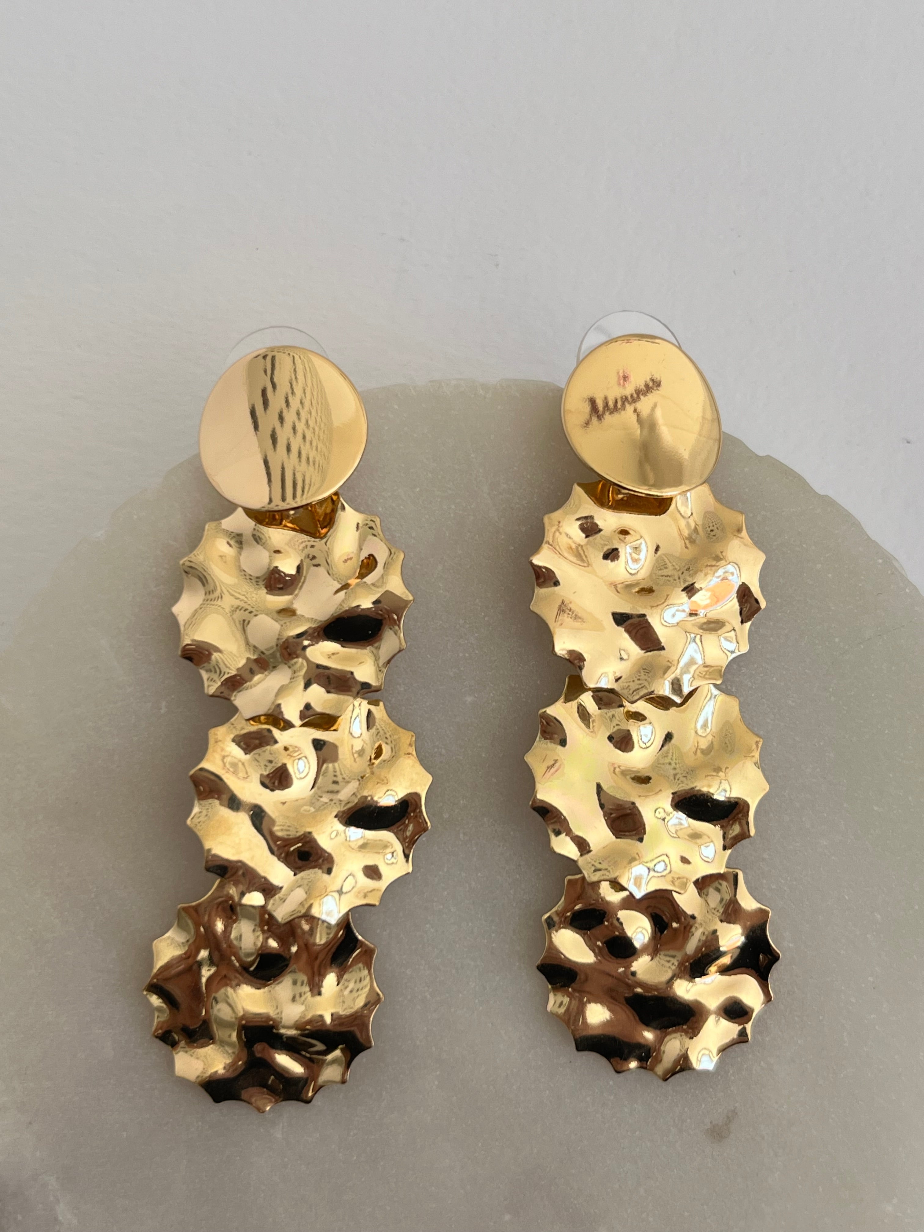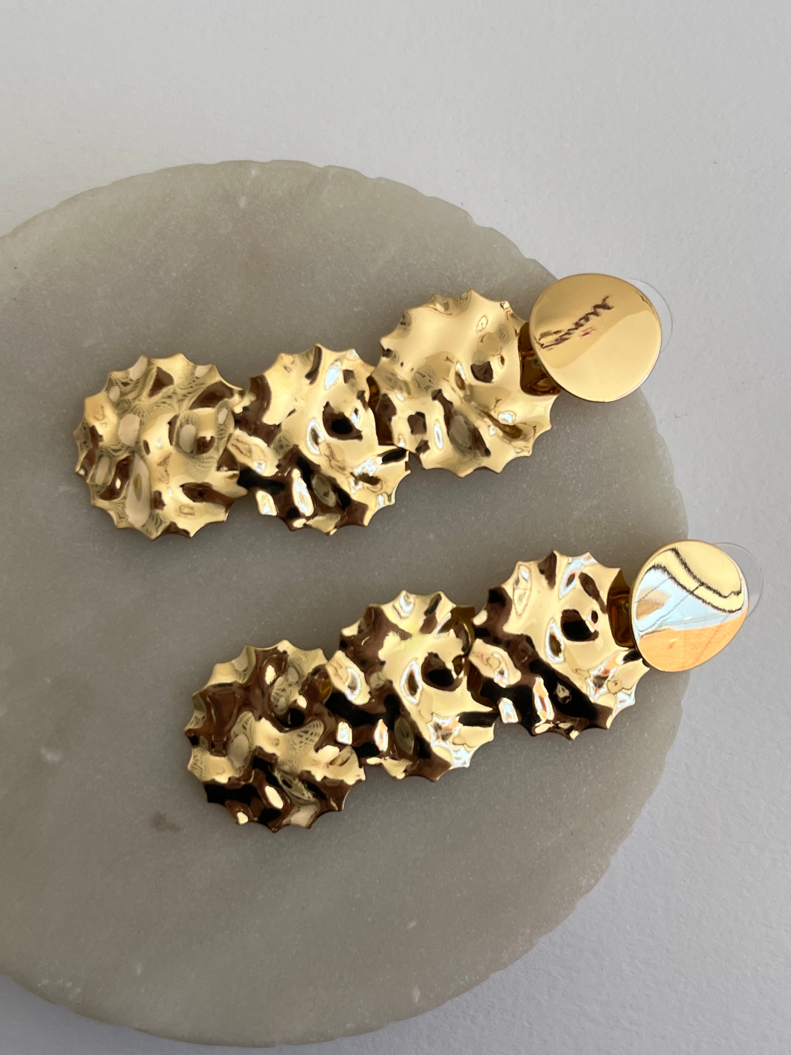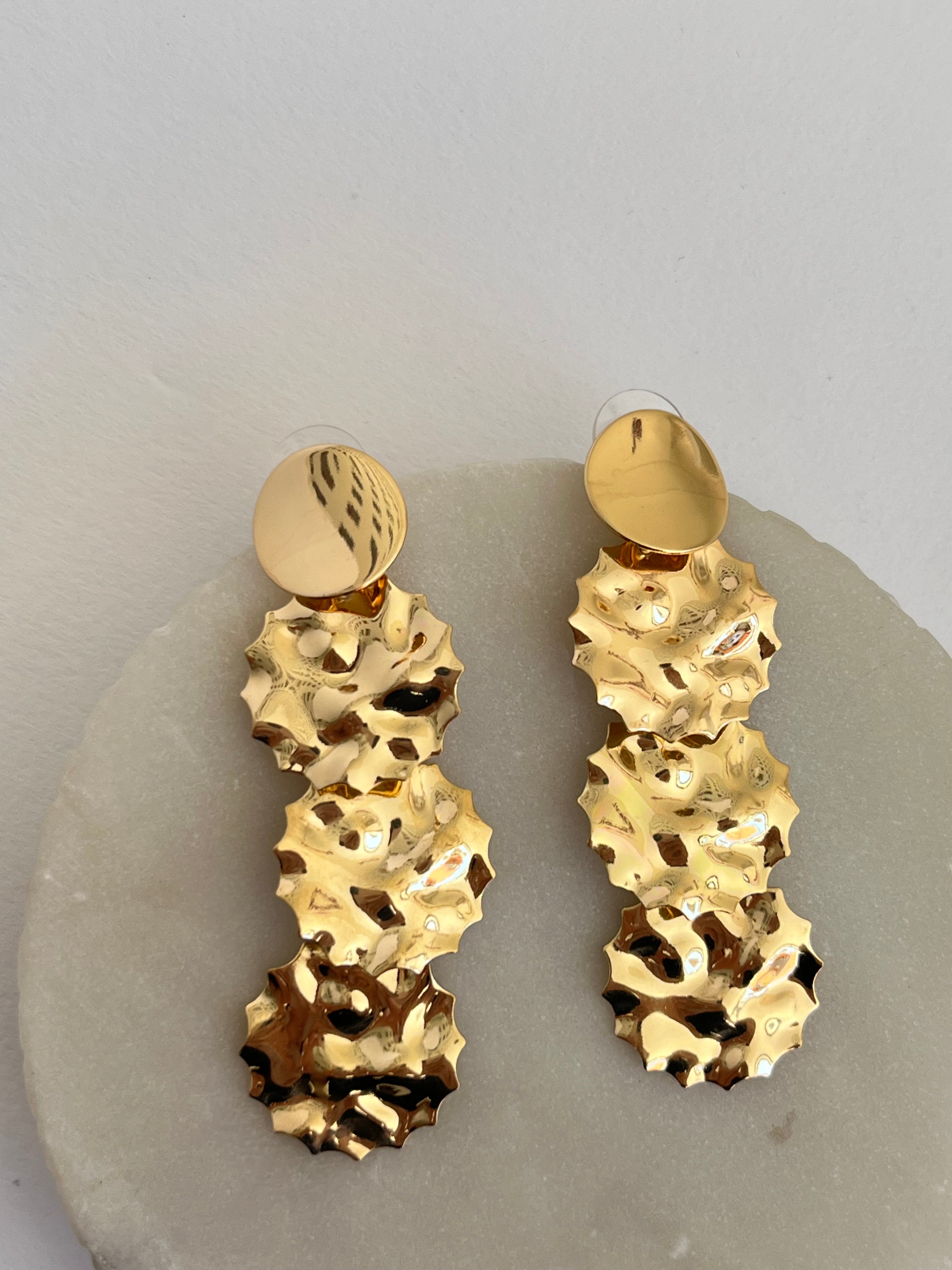 Estos espectaculares Aretes Chandelier son una pieza statement diseñada para deslumbrar. Cuentan con una base superior de disco pulido que se conecta a una cascada de tres niveles.