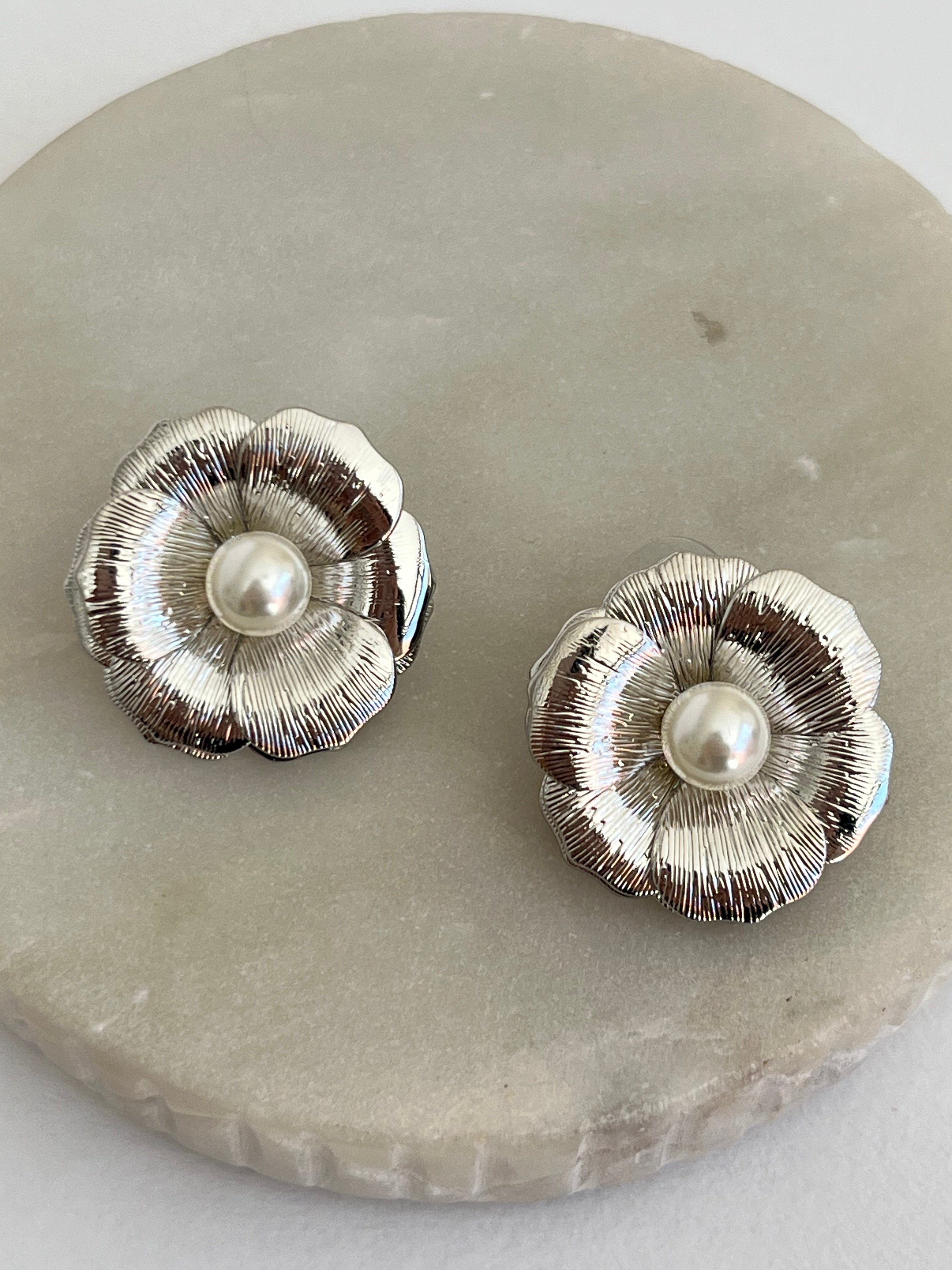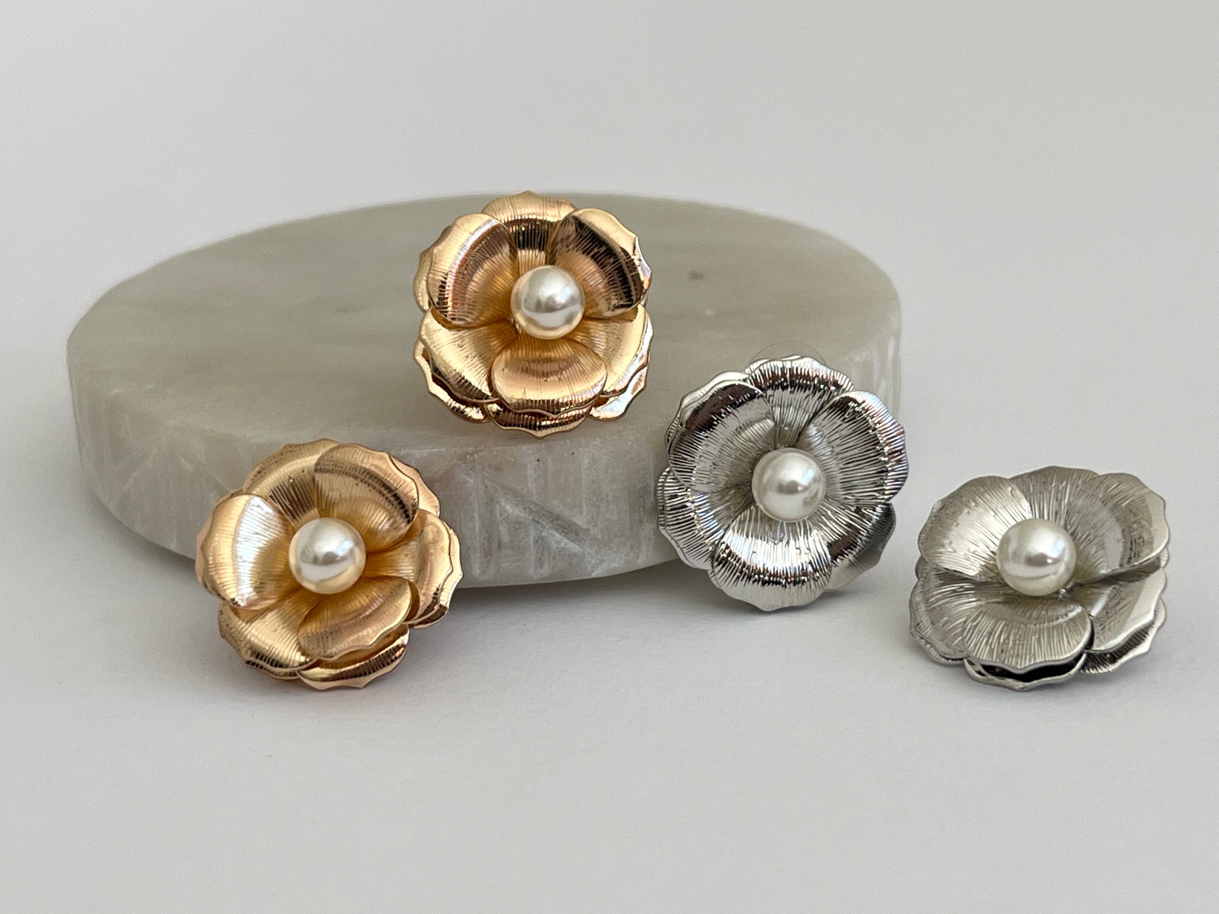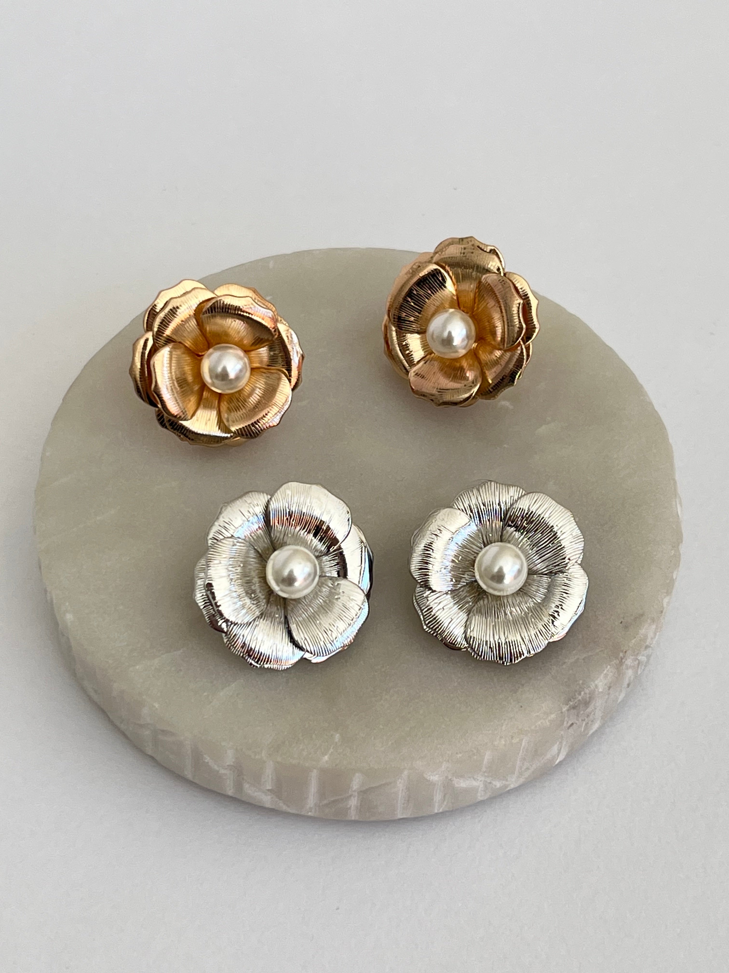 Estos son aretes de botón elegantes y clásicos que combinan el brillo del metal dorado con la suavidad de la perla.