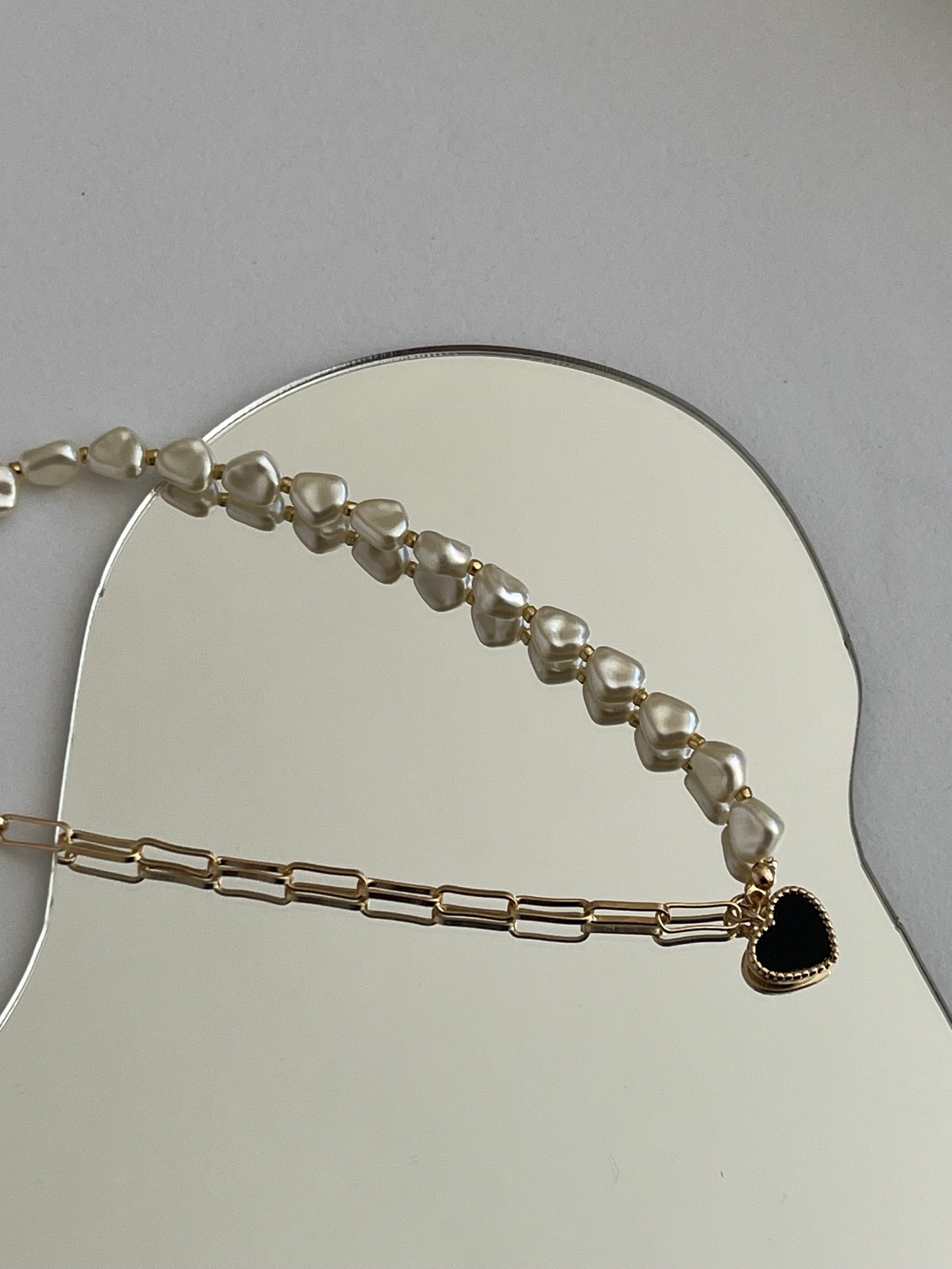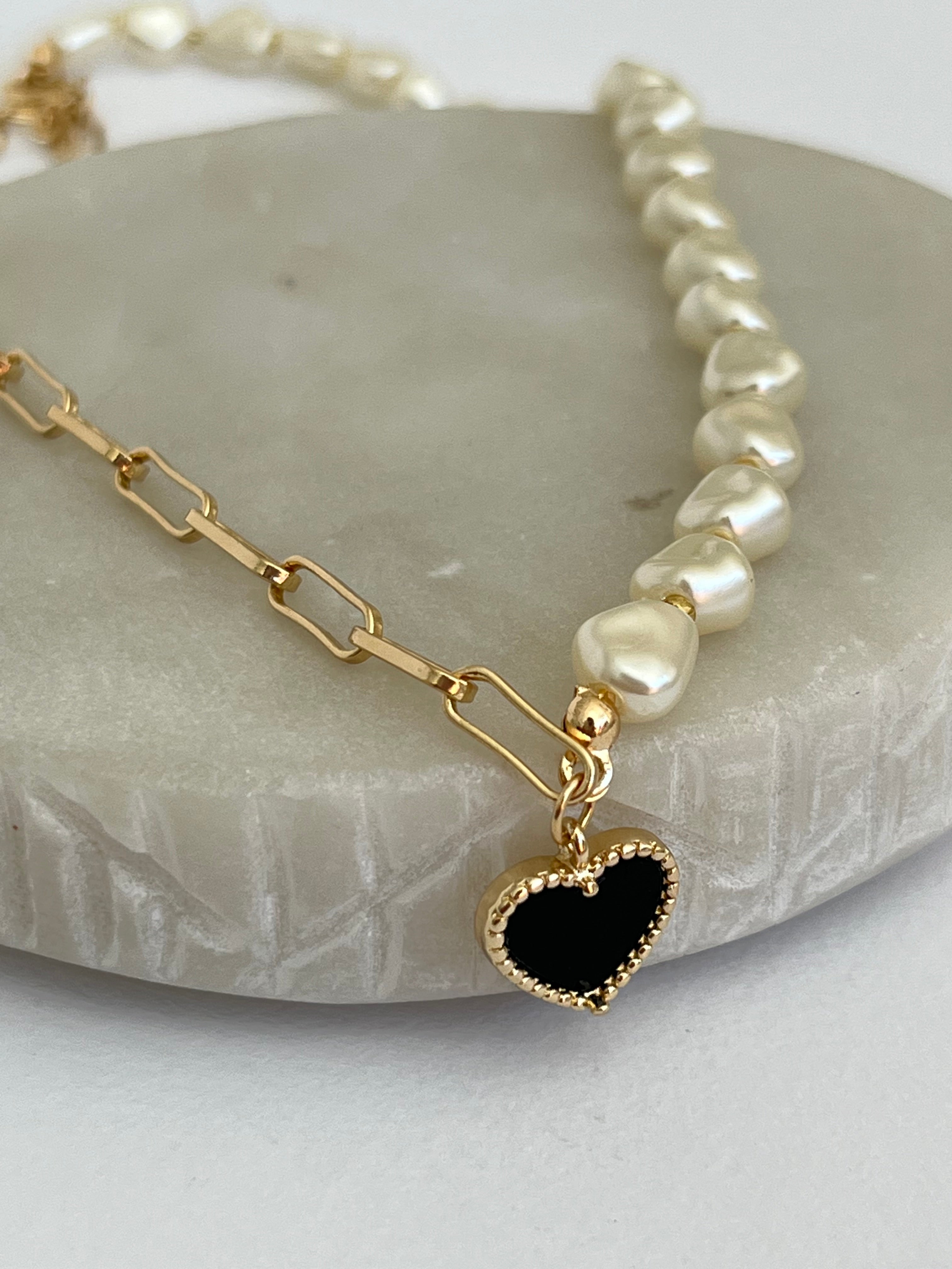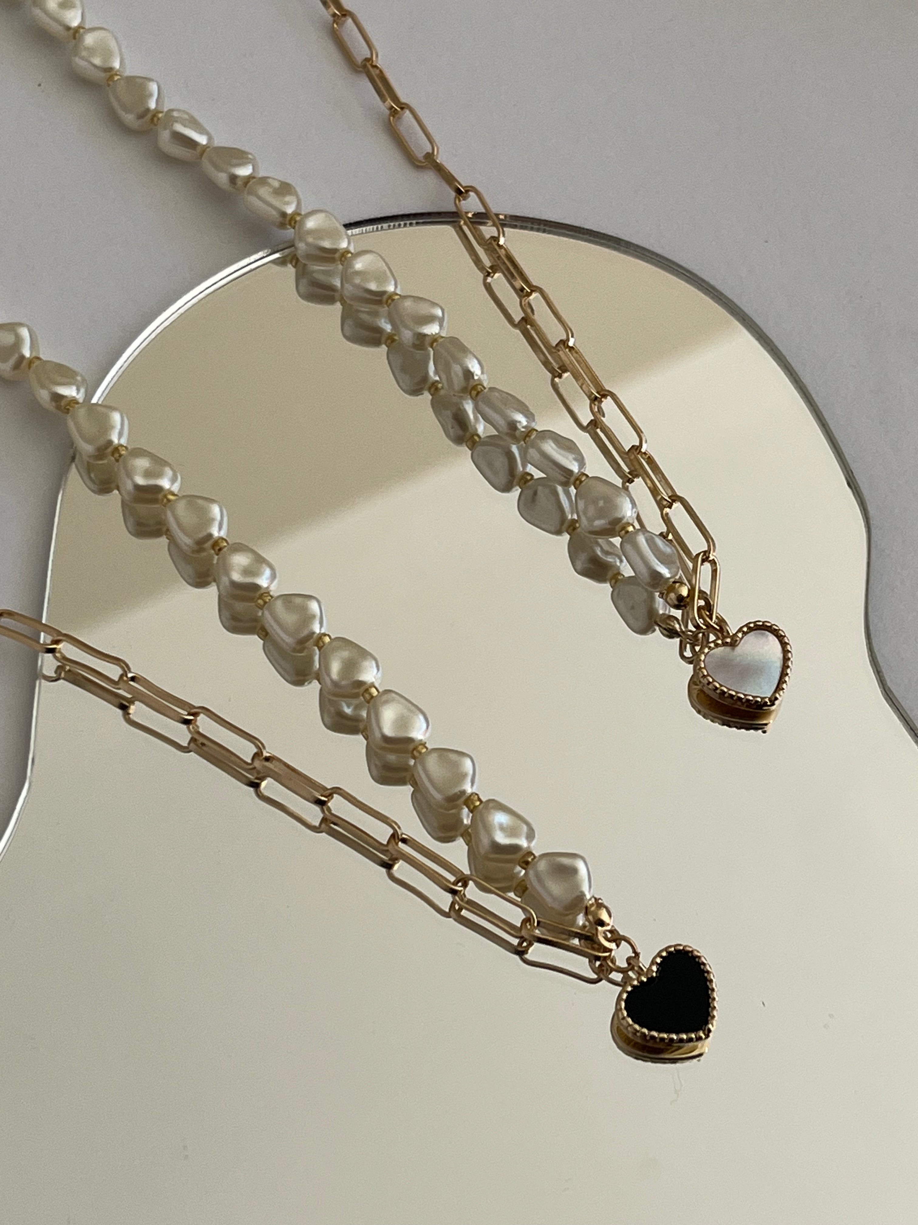 Perlas de rio y eslabones delicados, con dije colgante de corazón esmaltado en color negro o blanco. Perfecto para el día a día.