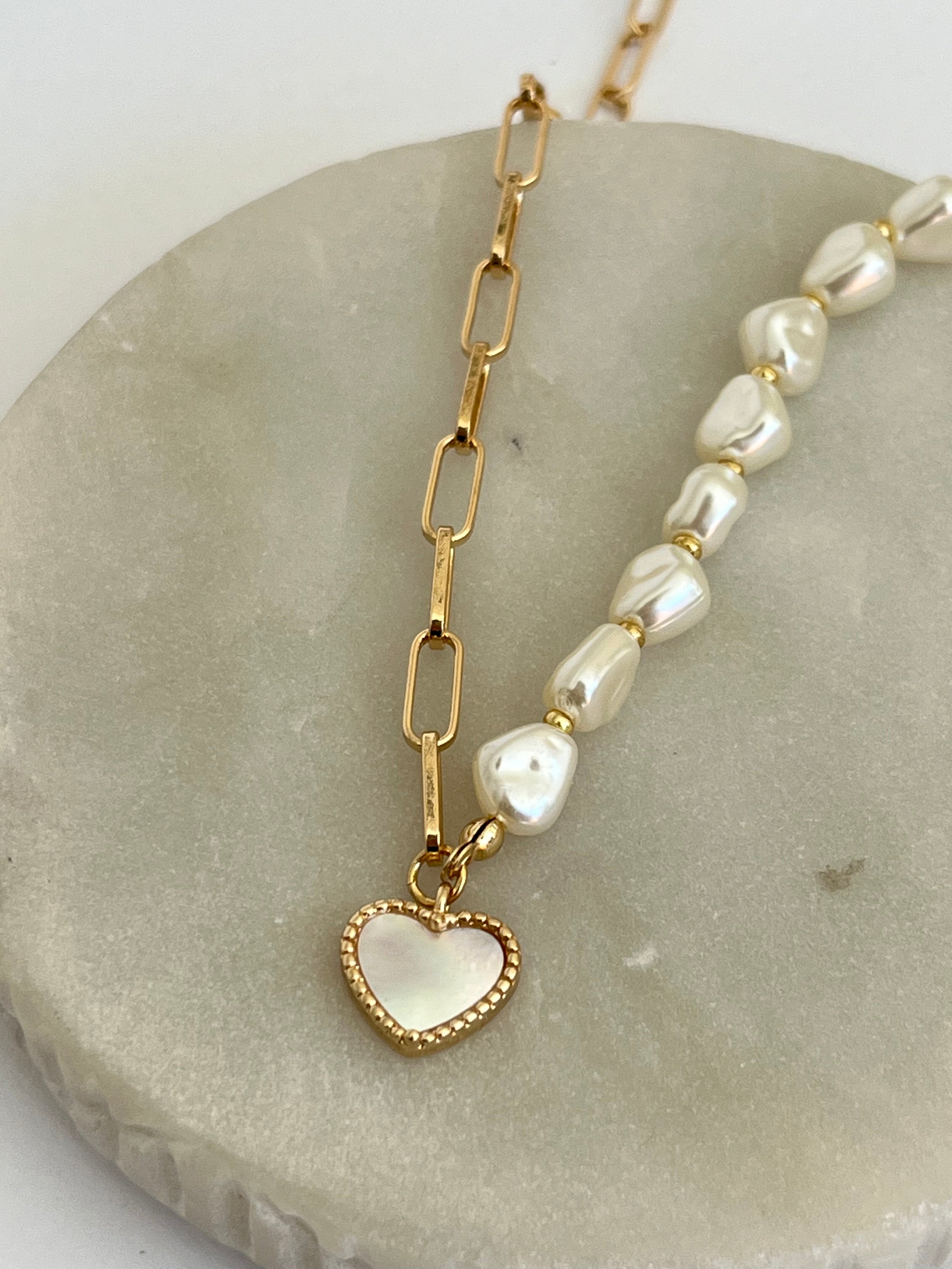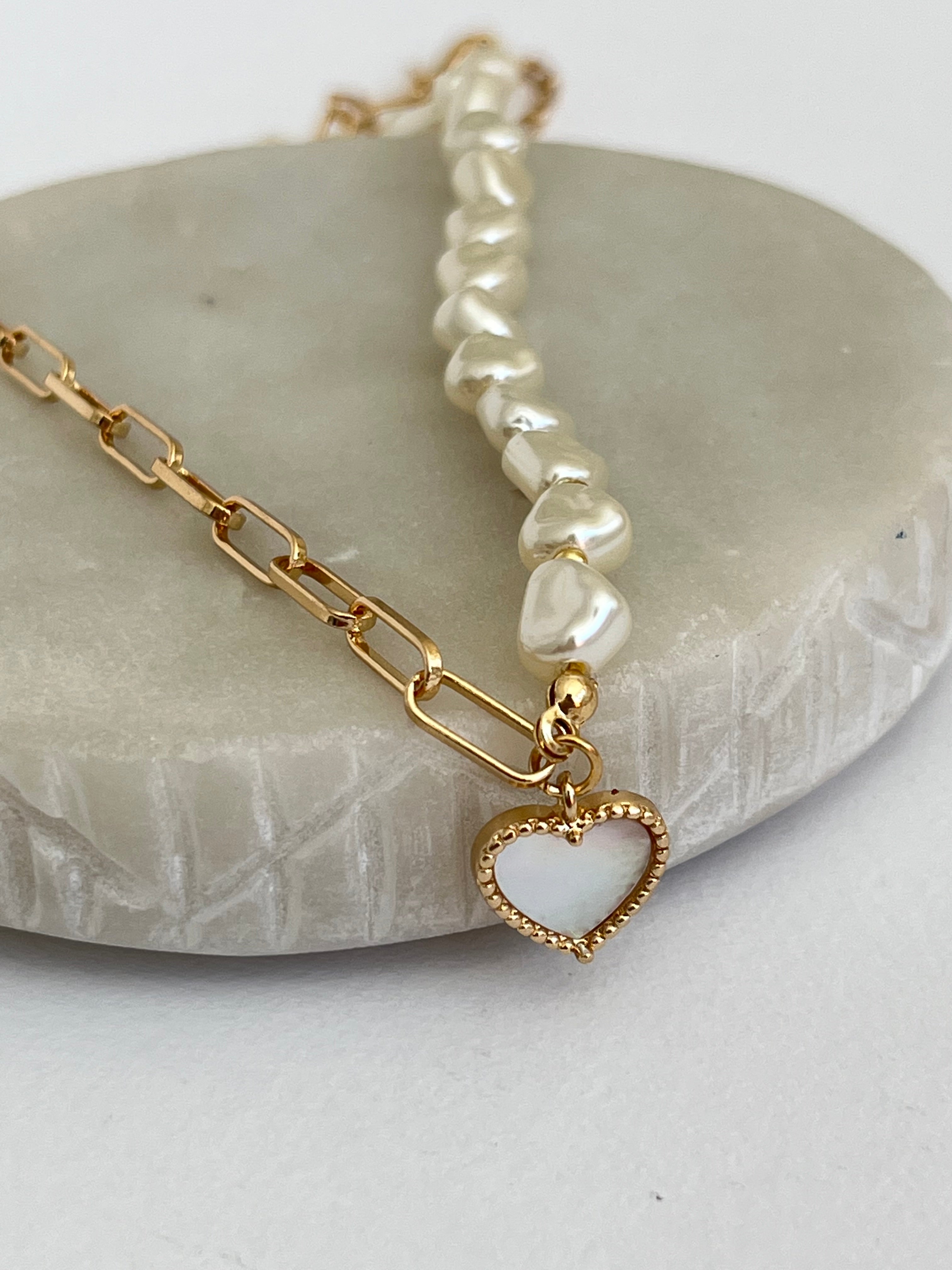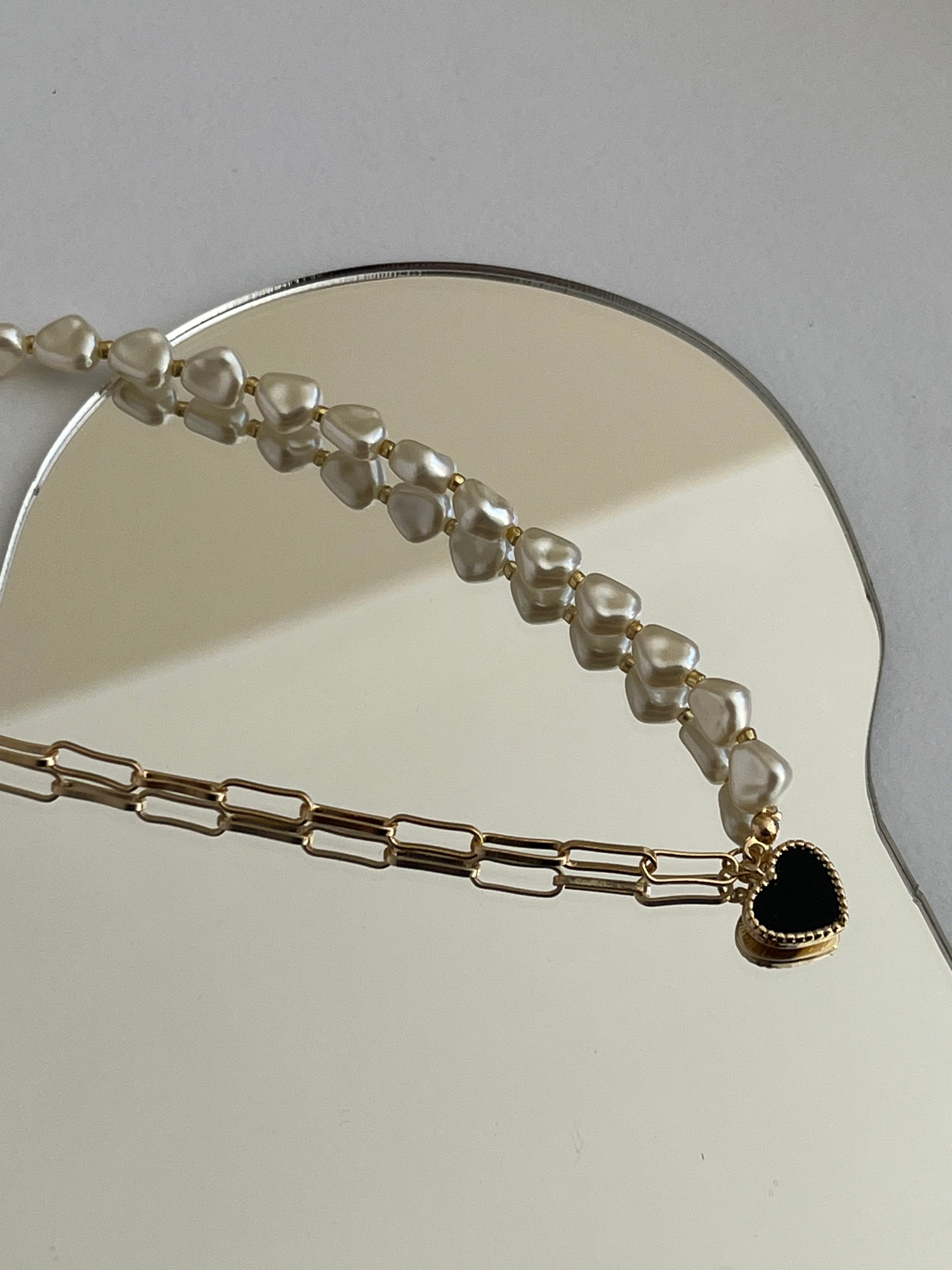Perlas de rio y eslabones delicados, con dije colgante de corazón esmaltado en color negro o blanco. Perfecto para el día a día.
