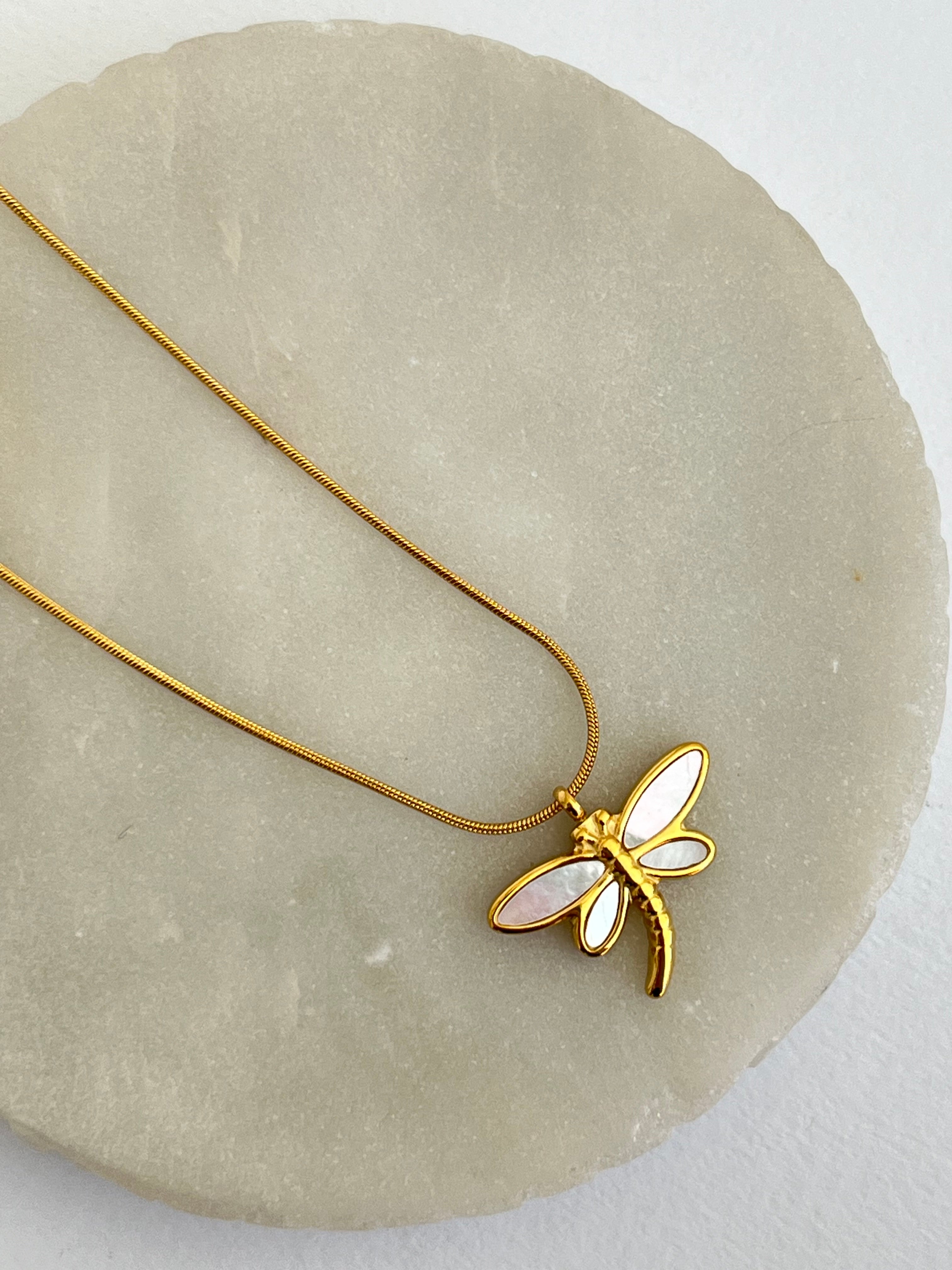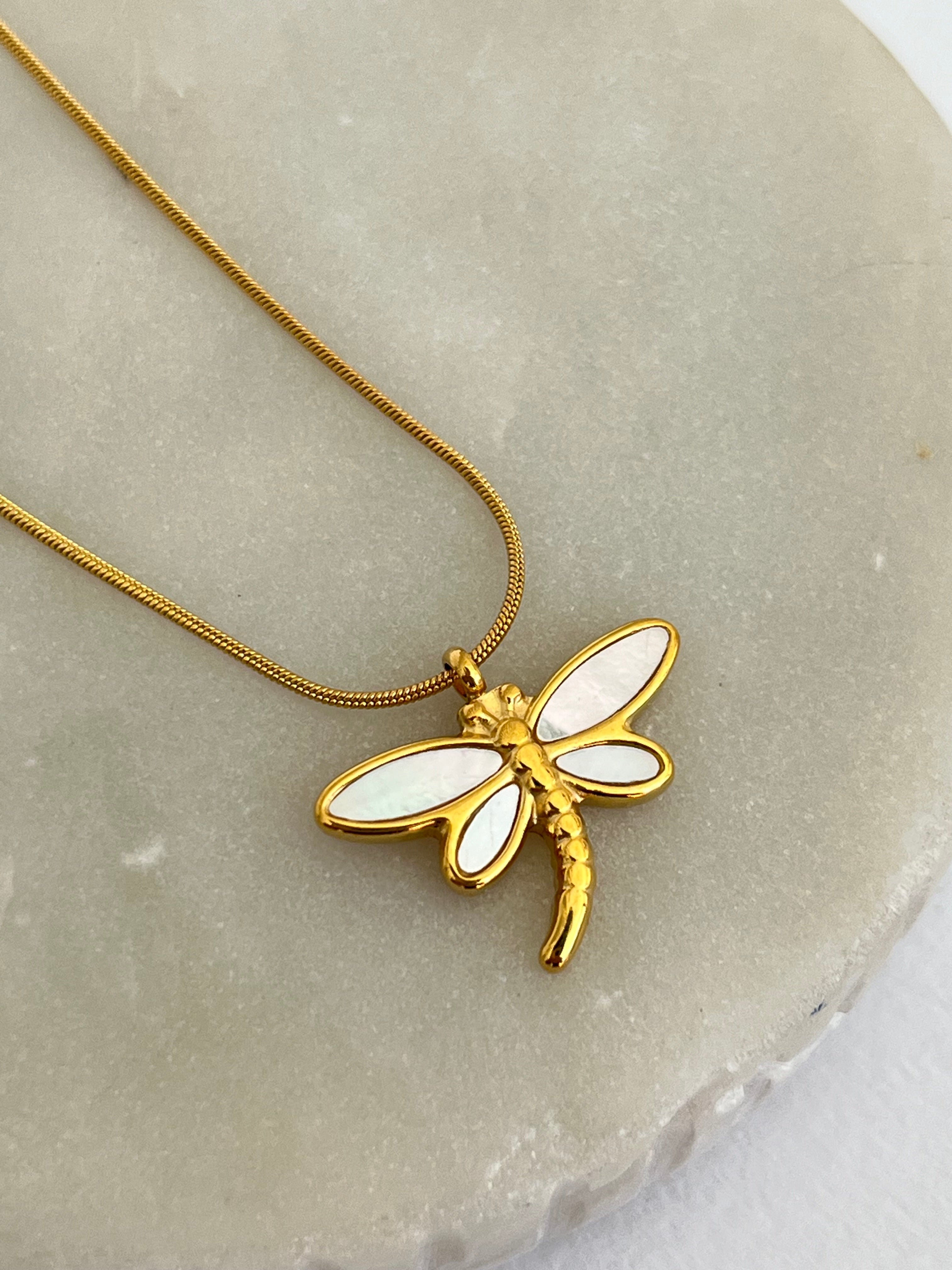 Una perfecta libélula fabricada en acero y enchapada en nácar.