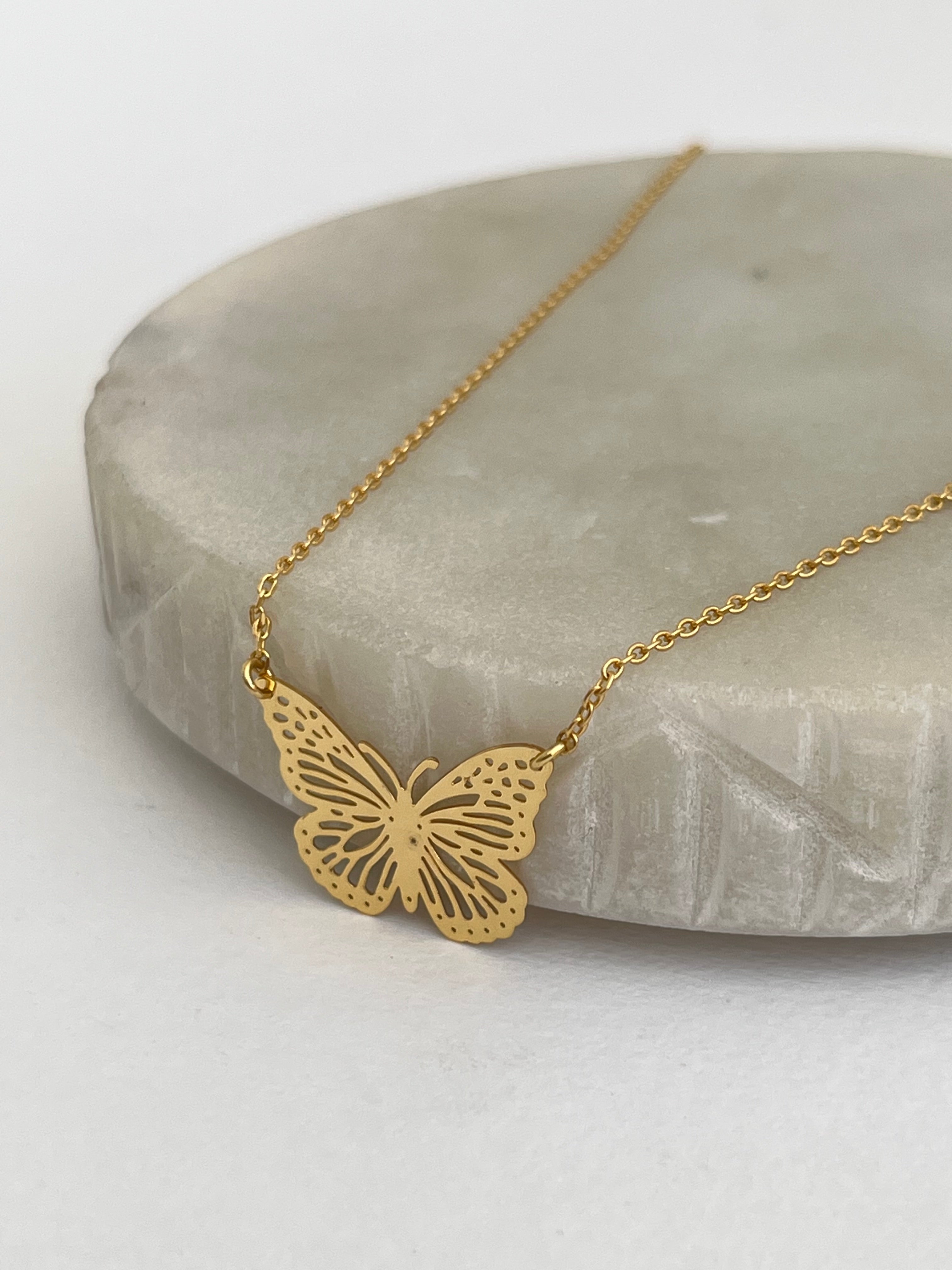 Collar de brass en baño de oro con dije de mariposa de filigrana.