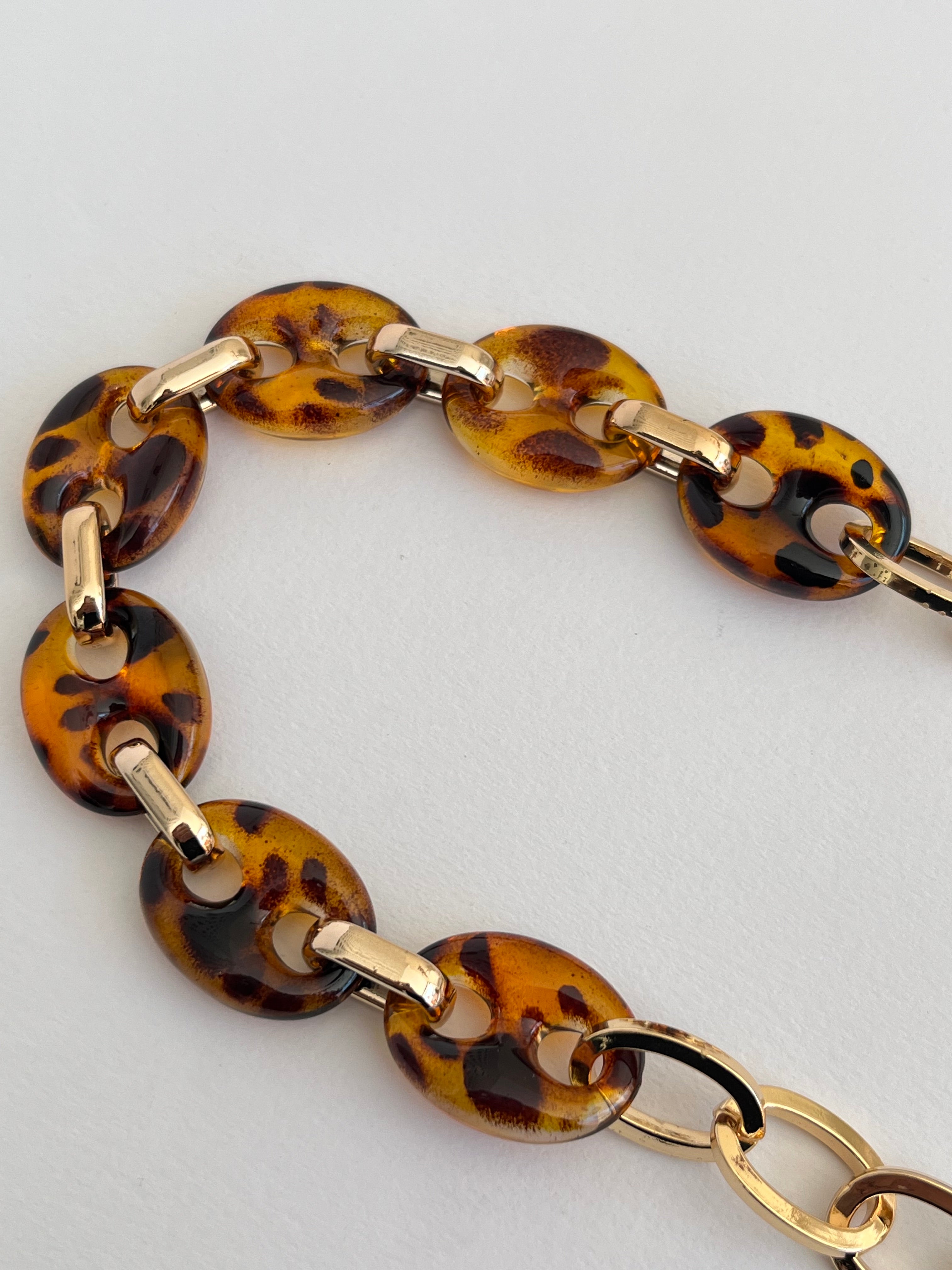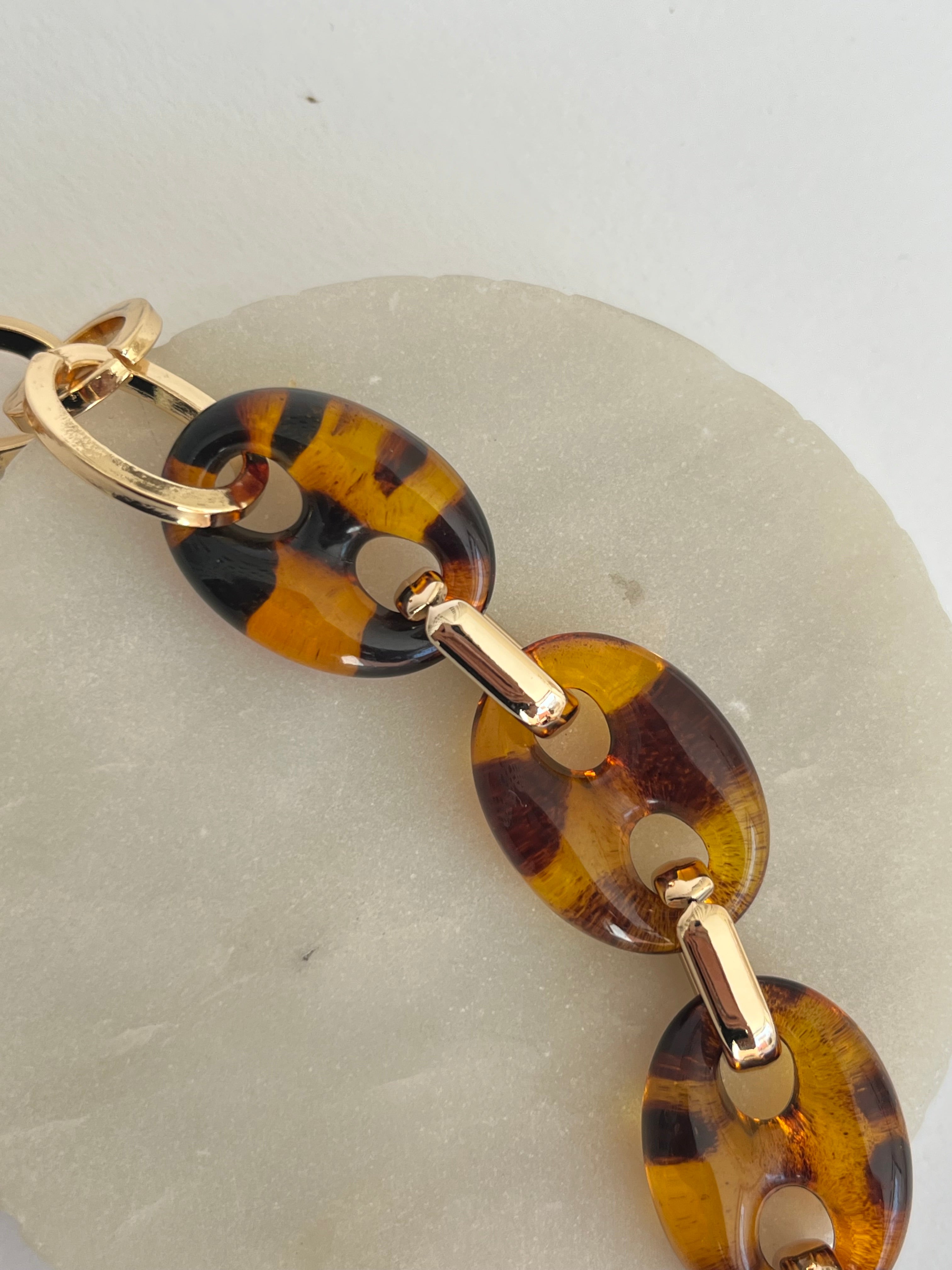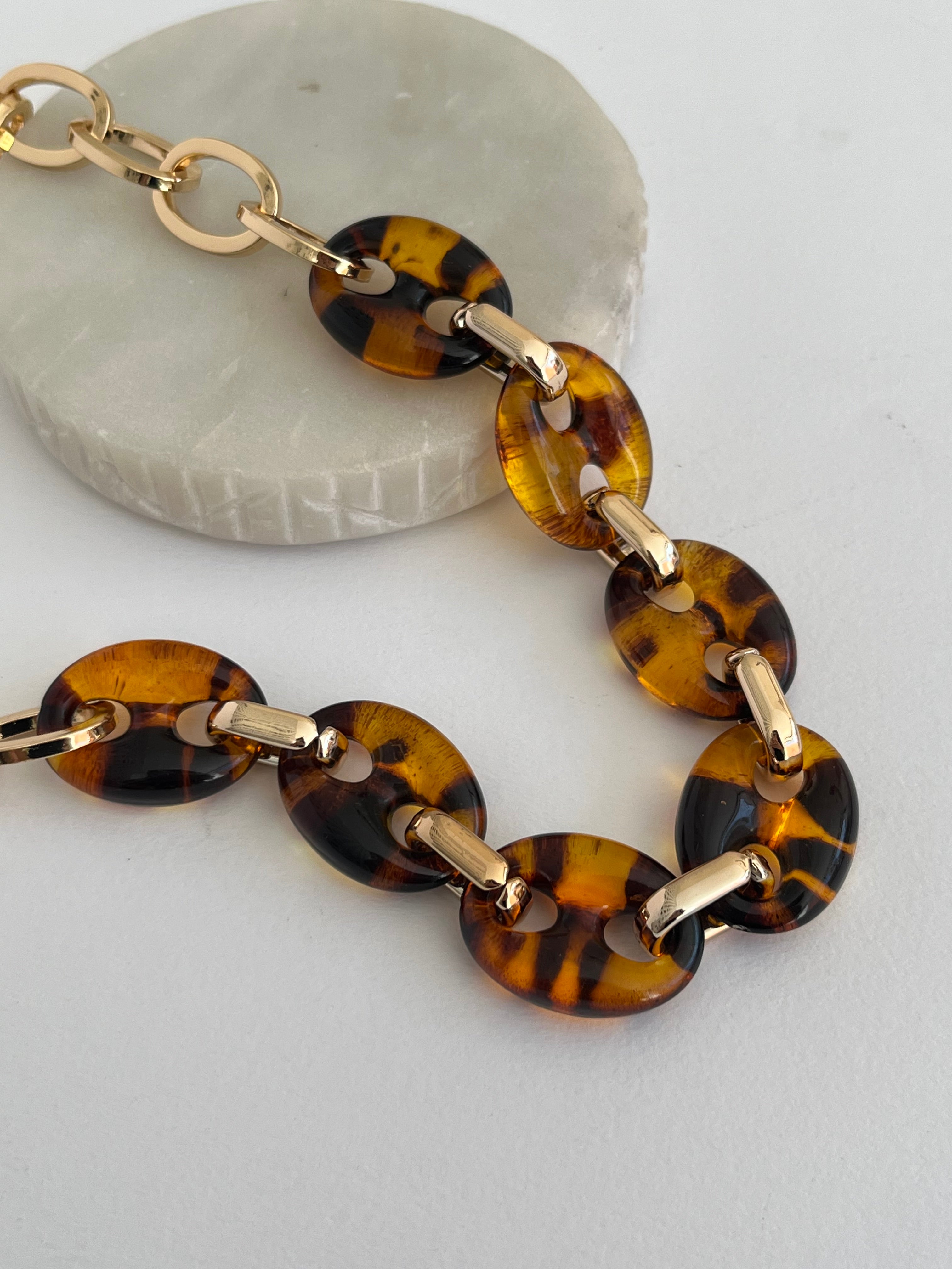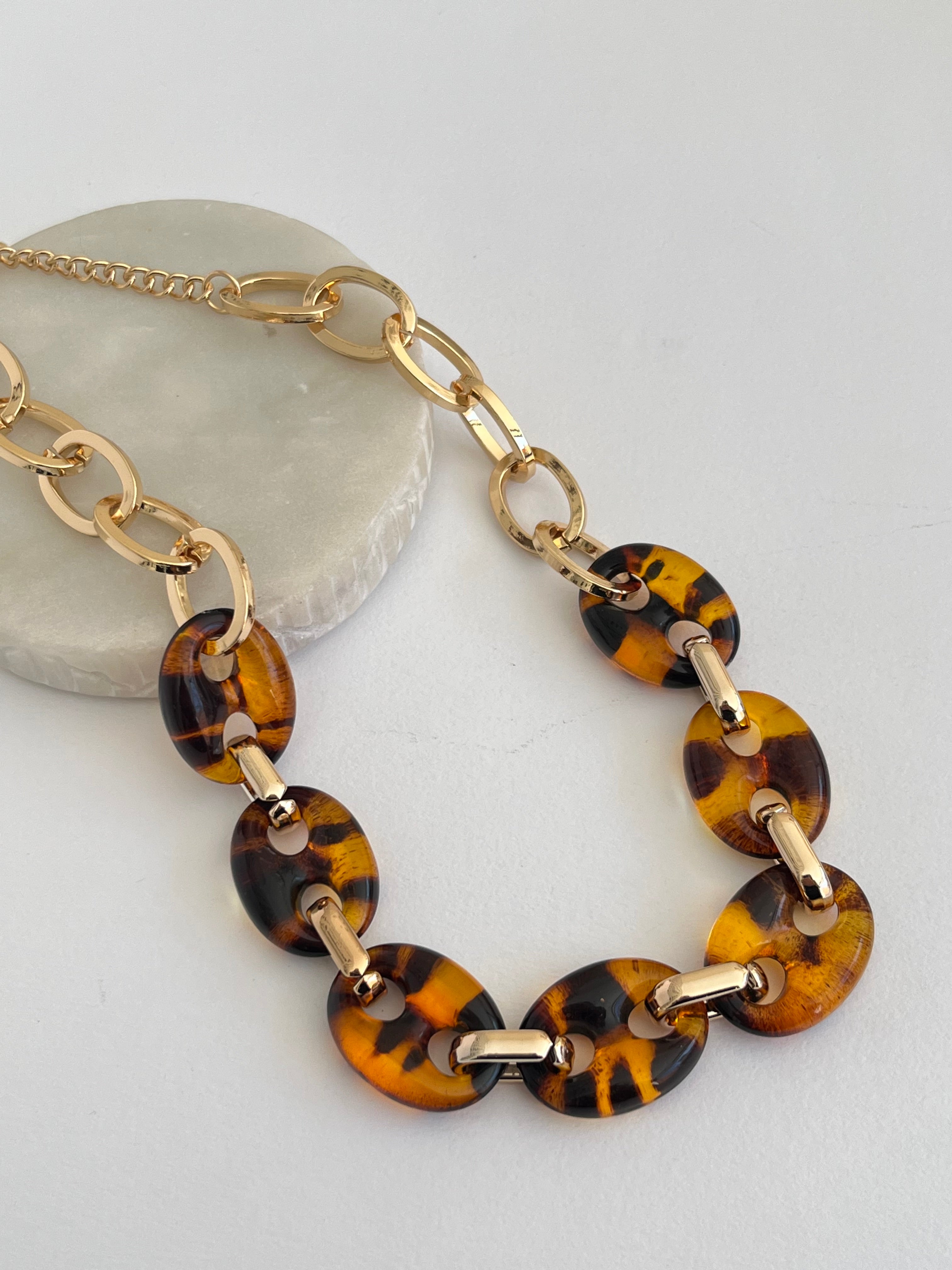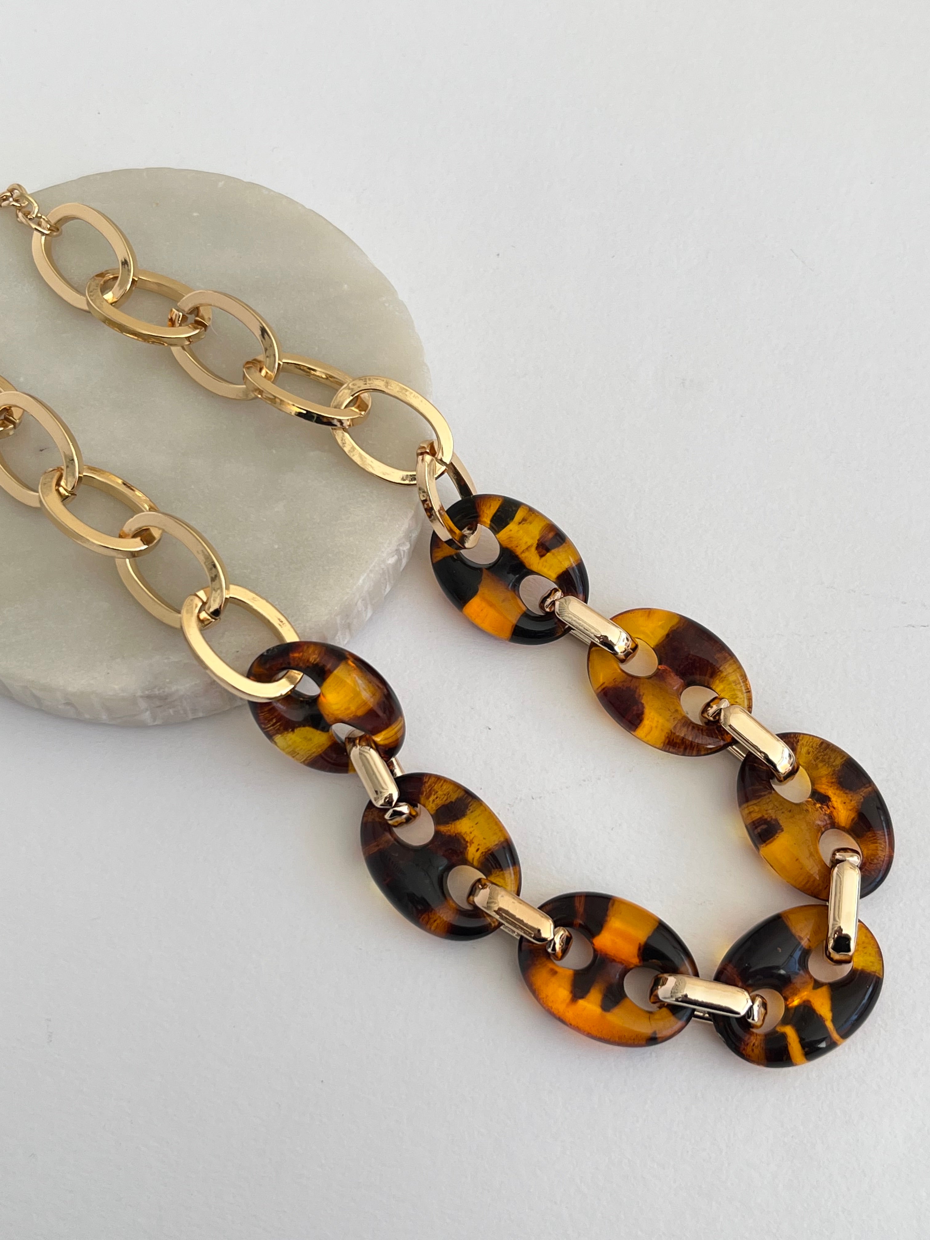 Los tonos tierra de Libia son perfectos para llevar no solo en el verano, pero durante todo el año! Un collar chunky pero muy ligero que combina eslabones de acrílico y nuestro metal libre de níquel y plomo.